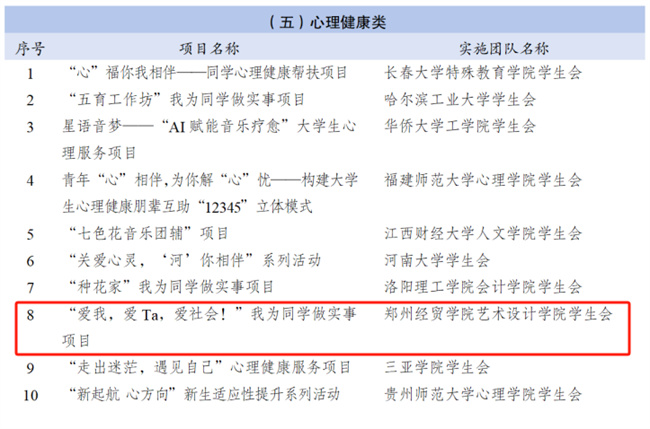 《“愛我,愛Ta,愛社會!”我為同學做實事項目》聚焦大學生心理健康知識學習和宣傳普及,具體由學校藝術設計學院學生會負責開展。該項目在制作調查問卷和了解同學需求的基礎上,開展多樣化、寓教于樂的活動豐富同學們的課余生活,加深同學們對心理健康的認識和理解,提高同學們的心理素質和心理適應能力,幫助同學們解決心理問題,促進個人成長。