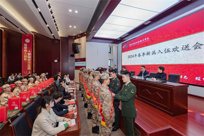 學院退伍復學學生代表為入伍新兵佩戴紅花并發(fā)放紀念品