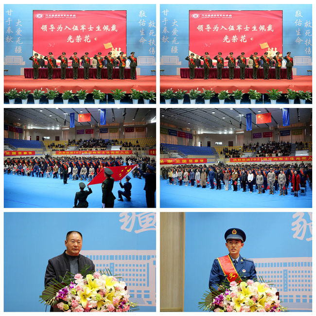 校領(lǐng)導(dǎo)與部隊領(lǐng)導(dǎo)為2021級入伍軍士生代表佩戴光榮花。2021級入伍軍士生家長代表金偉、2021級入伍軍士生代表趙弘歷辰發(fā)言。2021級軍士生面對國旗莊嚴宣誓。聽黨指揮、牢記使命、保持作風(fēng)、堅守初心等錚錚誓言展現(xiàn)了2021級軍士生即將入伍、獻身國防的堅定信念。文藝匯演上,節(jié)目精彩紛呈,為2021級入伍軍士生送上了飽含深情的祝福。