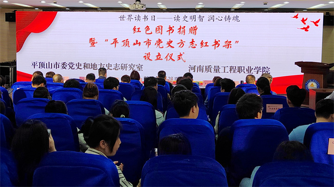 中新河南網(wǎng)4月24日電 4月23日,在第29個(gè)世界讀書(shū)日到來(lái)之際,在第三屆全民閱讀節(jié)活動(dòng)啟動(dòng)之日,為扎實(shí)推進(jìn)黨史方志“七進(jìn)”工作,平頂山市委黨史和地方史志研究室與河南質(zhì)量工程職業(yè)學(xué)院“紅色圖書(shū)捐贈(zèng)暨平頂山黨史方志紅書(shū)架設(shè)立儀式”在該院第二學(xué)術(shù)報(bào)告廳舉行。平頂山市委黨史和地方史志研究室主任蘇紅英,學(xué)院領(lǐng)導(dǎo)邱紅標(biāo)、姜葆亮、席會(huì)平、張留成出席活動(dòng)。