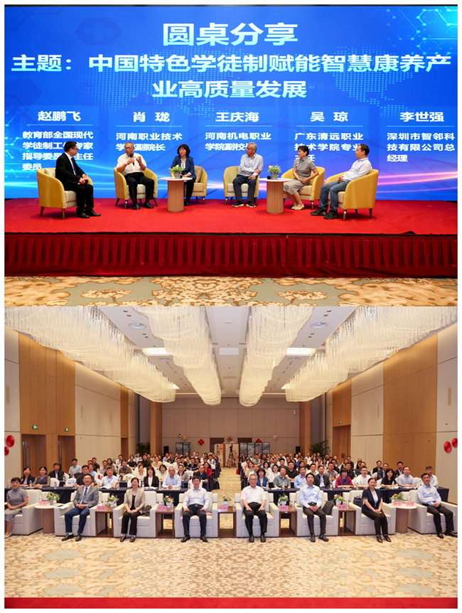 成立儀式后,趙鵬飛作《中國特色學徒制的實踐與思考》主旨報告;隨后,趙鵬飛、吳瓊與河南職業(yè)技術學院副校長肖瓏、河南機電職業(yè)學院副校長王慶海、深圳市智鄰科技有限公司總經(jīng)理李世強以“中國特色學徒制賦能智慧康養(yǎng)產(chǎn)業(yè)高質量發(fā)展”為題進行了圓桌分享。