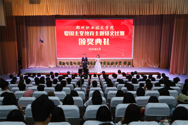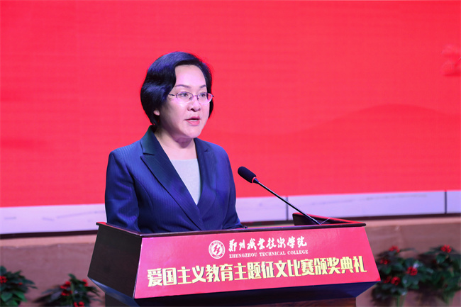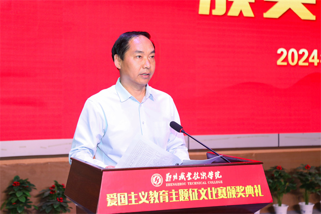 黨委副書記肖世才宣讀《中共鄭州職業(yè)技術(shù)學(xué)院委員會關(guān)于公布愛國主義教育主題征文比賽評選結(jié)果的通知》,宣布獲獎師生名單。