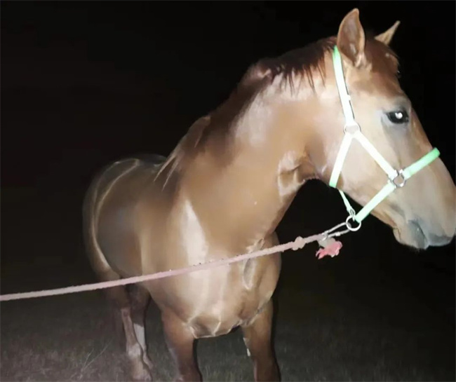 “迎面跑過來一個(gè)黑影,走近了才看清楚是一匹馬。”馬賢輝說,馬的韁繩拖著地,他猜到可能是走失的馬。“太不安全了,畢竟是大路,路燈又少,晚上經(jīng)常會(huì)大貨車從這里過。”想到交通隱患,他試探著對(duì)馬喊了一聲,沒想到馬兒真的停下了。于是,他就近將馬兒拴在樹上,并撥打了110報(bào)警電話。大概20分鐘后,警察叔叔趕來。