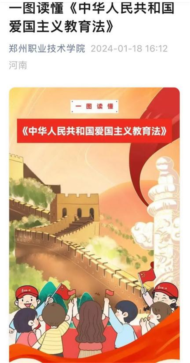 充分運用校報、條幅、宣傳欄、網(wǎng)站、微信公眾號等宣傳載體和學(xué)習(xí)強國、全國高校思想政治工作網(wǎng)等在線學(xué)習(xí)平臺,廣泛開展愛國主義宣傳教育,營造濃厚學(xué)習(xí)氛圍。在2024年1月1日《中華人民共和國愛國主義教育法》正式施行后,學(xué)校利用微信公眾號進行大力宣傳,實現(xiàn)愛國主義教育“指尖共享”“一鍵供給”。