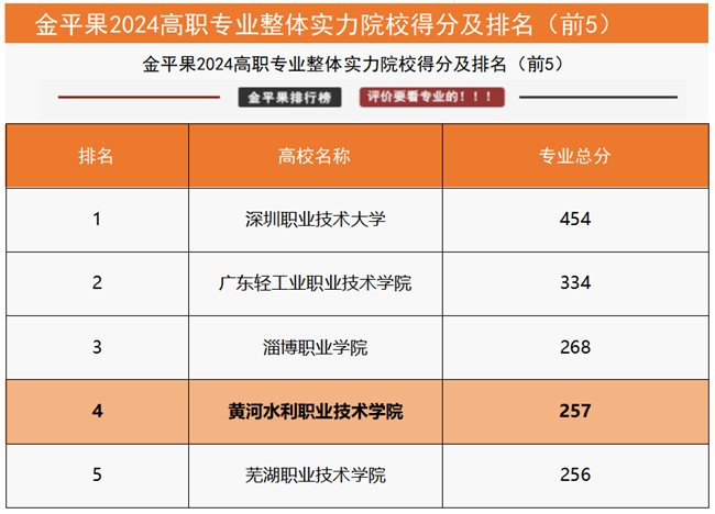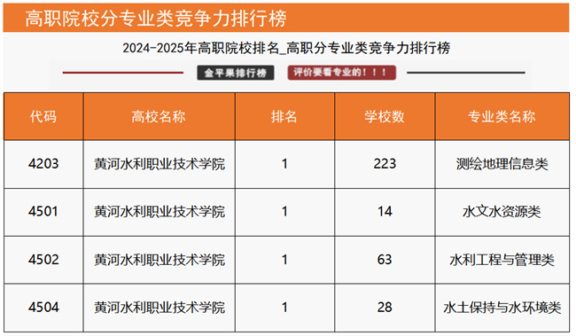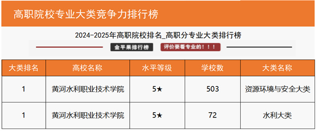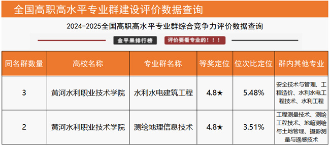 “國(guó)家級(jí)高水平專業(yè)群綜合競(jìng)爭(zhēng)力評(píng)價(jià)”數(shù)據(jù)顯示,黃河水利職業(yè)技術(shù)學(xué)院水利水電建筑工程專業(yè)群、測(cè)繪地理信息專業(yè)群2個(gè)高水平專業(yè)群上榜入圍,在同類專業(yè)群中位列全國(guó)第一;“高職院校分專業(yè)大類競(jìng)爭(zhēng)力排行榜”數(shù)據(jù)顯示,該校資源環(huán)境與安全大類、水利大類2個(gè)分專業(yè)大類均位列全國(guó)第一;“高職院校分專業(yè)類競(jìng)爭(zhēng)力排行榜”數(shù)據(jù)顯示,該校測(cè)繪地理信息類、水文水資源類、水利工程與管理類、水土保持與水環(huán)境類4個(gè)專業(yè)類均位列全國(guó)第一;“高職院校專業(yè)競(jìng)爭(zhēng)力排行榜”數(shù)據(jù)顯示,該校14個(gè)專業(yè)上榜,其中測(cè)繪地理信息技術(shù)、攝影測(cè)量與遙感技術(shù)、地籍測(cè)繪與土地管理、無人機(jī)測(cè)繪技術(shù)、水文與水資源技術(shù)、水利工程、智慧水利技術(shù)、水利水電工程技術(shù)、水利水電建筑工程、水土保持技術(shù)、水電站設(shè)備安裝與管理、治河與航道工程技術(shù)12個(gè)專業(yè)位列全國(guó)第一,測(cè)繪工程技術(shù)、水生態(tài)修復(fù)技術(shù)2個(gè)專業(yè)位列全國(guó)第二,土木工程檢測(cè)技術(shù)、環(huán)境檢測(cè)技術(shù)2個(gè)專業(yè)位列全國(guó)第三。