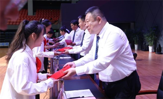王四戰(zhàn)為畢業(yè)生代表頒發(fā)“新愚公素養(yǎng)護(hù)照”。