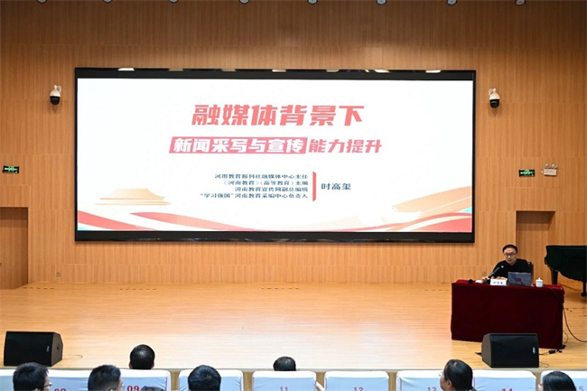 本次講座題為《融媒體背景下新聞采寫與宣傳能力提升》,由時高璽主編主講。黨委書記魏文君主持講座,黨委副書記任志強出席講座,學校全體中層干部,黨委宣傳部工作人員,各單位宣傳員、網(wǎng)評員,學校融媒體工作室全體成員共300余名師生參加講座。
