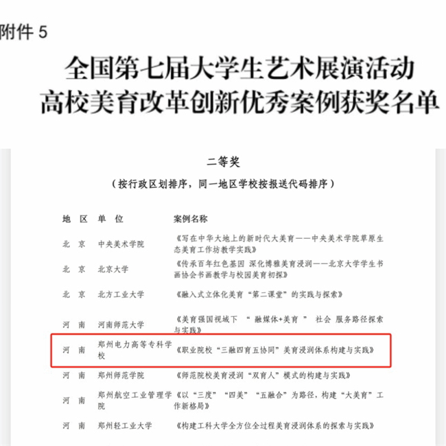 中新河南網(wǎng)6月21日電(王鑫茂) 近日,教育部官網(wǎng)發(fā)布關(guān)于全國(guó)第七屆大學(xué)生藝術(shù)展演活動(dòng)各項(xiàng)目評(píng)選結(jié)果的公示,鄭州電力高等專(zhuān)科學(xué)校美育改革創(chuàng)新優(yōu)秀案例《職業(yè)院校“三融四育五協(xié)同”美育浸潤(rùn)體系構(gòu)建與實(shí)踐》在全國(guó)第七屆大學(xué)生藝術(shù)展演中榮獲全國(guó)二等獎(jiǎng),實(shí)現(xiàn)了歷史性突破,標(biāo)志著鄭州電力高等專(zhuān)科學(xué)校在美育教育中取得重大成果!