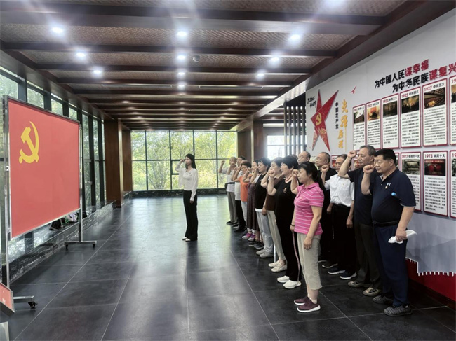 參觀結(jié)束后,全體黨員同志在鮮紅的黨旗前,舉起右拳,重溫了入黨誓詞。