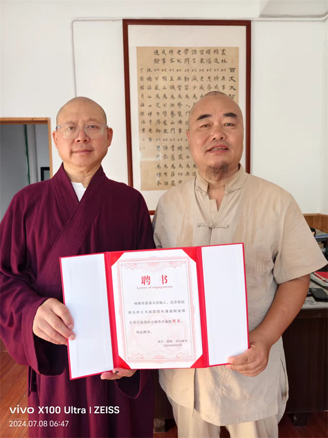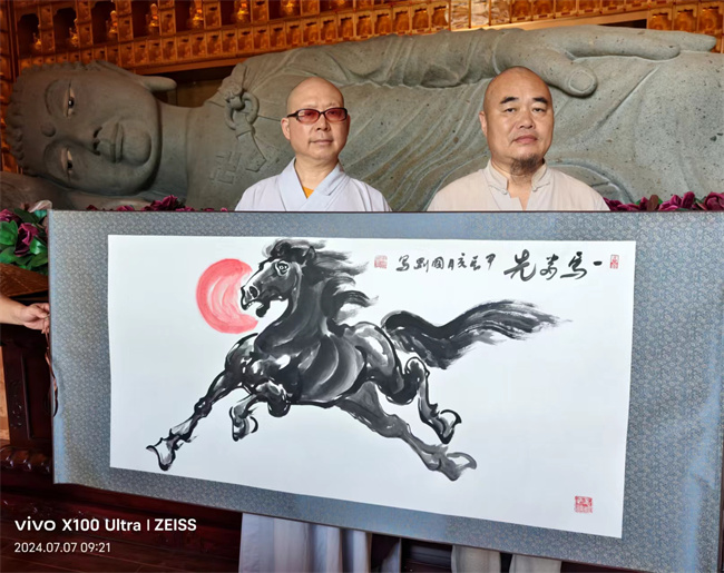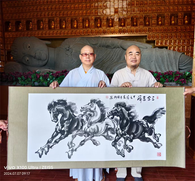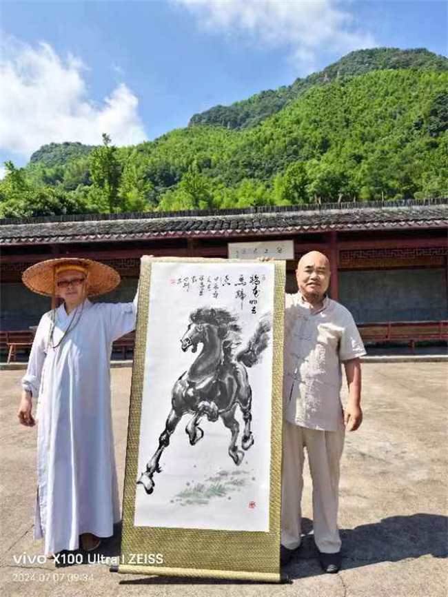 他與浙江臨海仙山禪寺釋心善大和尚的交往,得益于一段奇緣。他偶然從他的老友釋鴻福禪師口中得知,釋心善大和尚是一個大佛醫(yī),自幼跟隨名師學(xué)滿中醫(yī)13科,出家后慈悲為為懷,以佛法醫(yī)治人心,以中醫(yī)醫(yī)治人身疾病,幾十年來治愈了無數(shù)的患者。釋心善大和尚與潘國剛老師同為屬馬之人,由于因緣和合潘國剛老師被聘為臨海仙山禪寺書畫院的首任院長。潘國剛老師剛到仙山禪寺就賦詩一首: