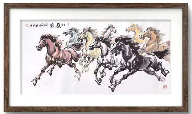 他的一馬當(dāng)先、二馬相依、華夏三義、四季財馬、五福臨門、吉祥六駿、七駿爭雄、八駿雄風(fēng)等作品,以其豪邁的奔騰之勢打動了無數(shù)人的心,甚至作為中國優(yōu)秀傳統(tǒng)國畫走向世界……