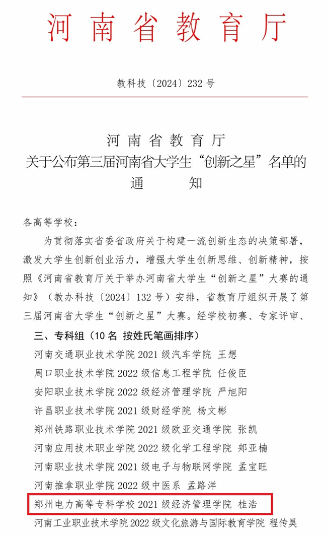 河南省創(chuàng)新之星評選是河南省教育廳深入貫徹落實省委省政府關(guān)于構(gòu)建一流創(chuàng)新生態(tài)的決策部署的一項重要評選活動,旨在通過表彰和激勵,激發(fā)大學(xué)生創(chuàng)新創(chuàng)業(yè)活力,增強大學(xué)生創(chuàng)新思維和創(chuàng)新精神。今年5月,河南省教育廳啟動第三屆河南省大學(xué)生“創(chuàng)新之星”遴選活動。經(jīng)過學(xué)院初選、鄭州電力高等專科學(xué)校復(fù)選、專家評審、省決賽、網(wǎng)絡(luò)點贊等環(huán)節(jié),桂浩同學(xué)以其堅持不懈,腳踏實地的創(chuàng)新創(chuàng)業(yè)精神,具有示范、帶動、輻射作用的科技創(chuàng)新成果斬獲了本年度河南省大學(xué)生“創(chuàng)新之星”榮譽。