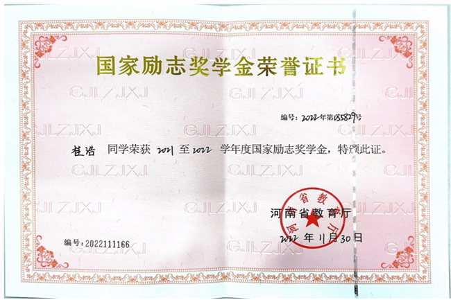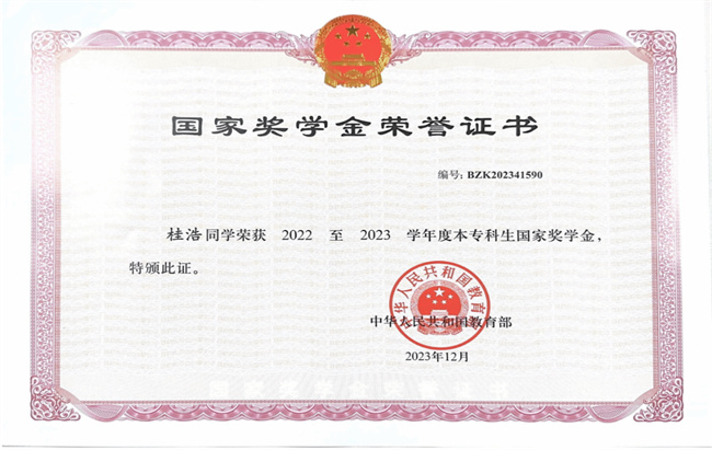 桂浩以“書山有路勤為徑,學(xué)海無涯苦作舟”為信念,在專業(yè)學(xué)習(xí)上,做到眼到、手到、心到。以嚴謹?shù)膶W(xué)習(xí)態(tài)度及獨立的自學(xué)能力,刻苦努力,學(xué)以致用。他認真學(xué)好每一門課程,打下了扎實的專業(yè)理論知識基礎(chǔ)。三年年度綜合成績排名1/92,并榮獲“國家獎學(xué)金”1次、“國家勵志獎學(xué)金”1次、“校級一等獎學(xué)金”5次,獲得學(xué)校“優(yōu)秀學(xué)生干部”、“優(yōu)秀畢業(yè)生”、“三好學(xué)生”、“優(yōu)秀共青團干部”等榮譽稱號。