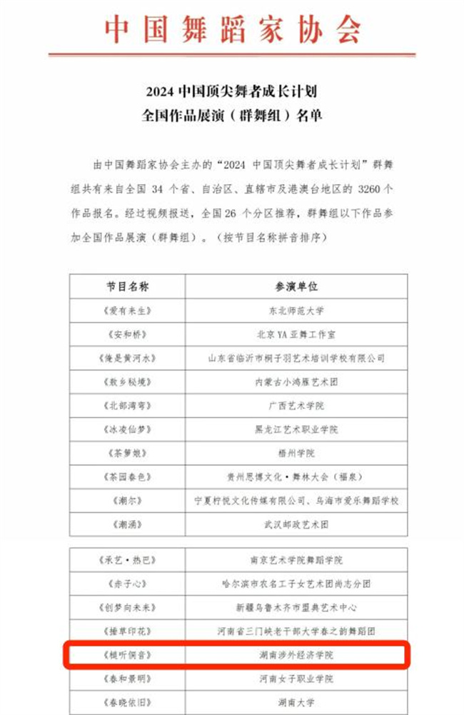 舞蹈作品《槌聽(tīng)侗音》入圍全國(guó)展演名單是對(duì)學(xué)校舞蹈教學(xué)的肯定與鼓勵(lì)。音樂(lè)學(xué)院黃亞副院長(zhǎng)也曾在《光明日?qǐng)?bào)》《中國(guó)教育報(bào)》《人民論壇網(wǎng)》等媒體上發(fā)表署名文章,介紹學(xué)校在青年教師人才隊(duì)伍建設(shè),以及學(xué)院在舞蹈課程教學(xué)創(chuàng)新上的亮點(diǎn)和做法。未來(lái),湖南涉外經(jīng)濟(jì)學(xué)院將繼續(xù)完善和優(yōu)化教學(xué)體系,培養(yǎng)學(xué)生藝術(shù)創(chuàng)造性思維,擴(kuò)展學(xué)生職業(yè)道路選擇,探究適合藝術(shù)類(lèi)學(xué)生的成長(zhǎng)發(fā)展和學(xué)院的創(chuàng)新發(fā)展之路。(湖南涉外經(jīng)濟(jì)學(xué)院供稿)