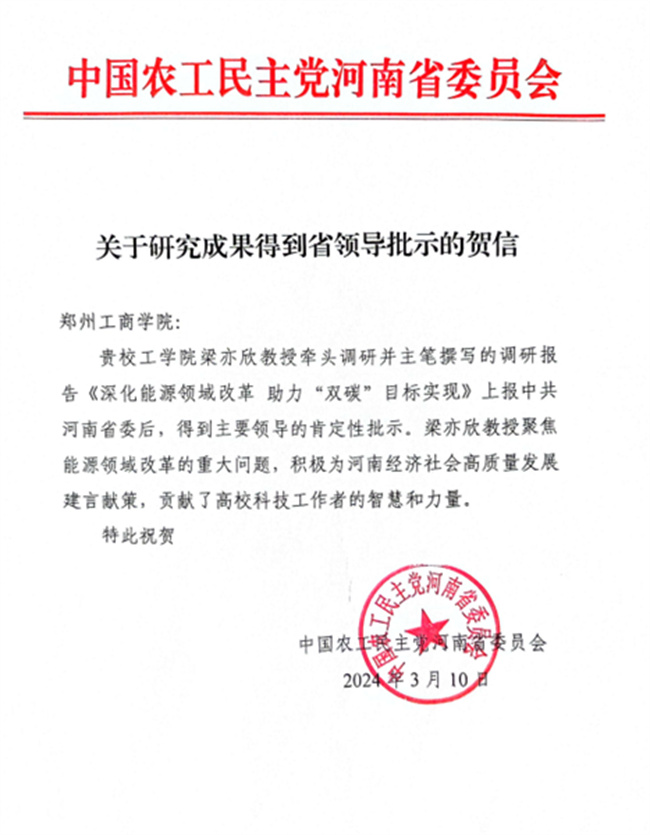 中新河南網(wǎng)7月22日電(梁亦欣) 近日,鄭州工商學(xué)院收到農(nóng)工黨河南省委會發(fā)來的賀信和證明,由該校工學(xué)院梁亦欣教授牽頭調(diào)研并主筆撰寫的調(diào)研報告《深化能源領(lǐng)域改革助力“雙碳”目標(biāo)實現(xiàn)》上報中共河南省委后,得到主要領(lǐng)導(dǎo)的肯定性批示;其主筆撰寫的《推進(jìn)新能源與新型儲能產(chǎn)業(yè)協(xié)同發(fā)展的建議》被河南省政協(xié)辦公廳《資政信息》(2024年第84期)刊用,并得到省領(lǐng)導(dǎo)的肯定性批示。