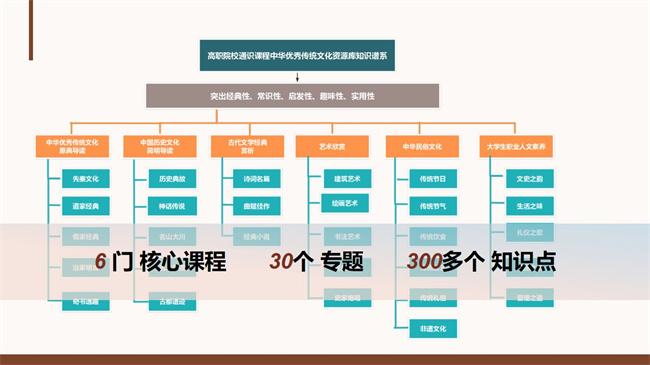 濟(jì)源職業(yè)技術(shù)學(xué)院組建了由中文、歷史、美術(shù)、音樂、旅游、設(shè)計(jì)等13個(gè)學(xué)科背景的教師團(tuán)隊(duì),結(jié)合學(xué)情實(shí)際,立足職業(yè)發(fā)展需求,構(gòu)建了融經(jīng)典性、通識性、啟發(fā)性、趣味性、實(shí)用性為一體,廣度、深度適宜的《中華優(yōu)秀傳統(tǒng)文化》資源庫知識譜系,建成教學(xué)資源庫,包括經(jīng)典導(dǎo)讀、文學(xué)欣賞、歷史文化、民俗文化、藝術(shù)欣賞、人文素養(yǎng)等六門主干課程,涵蓋了30個(gè)專題、300多個(gè)知識點(diǎn),模塊之間既相互關(guān)聯(lián),又彼此獨(dú)立,方便師生選學(xué)輔教。目前,資源庫已在智慧職教平臺上線,在微信視頻號、抖音號、B站上線,438個(gè)學(xué)校單位推廣應(yīng)用,20000多人開展在線學(xué)習(xí),新媒體平臺日點(diǎn)擊率達(dá)1000多人次,為高職院校師生教學(xué)提供了便利,在全社會普及中華優(yōu)秀傳統(tǒng)文化。