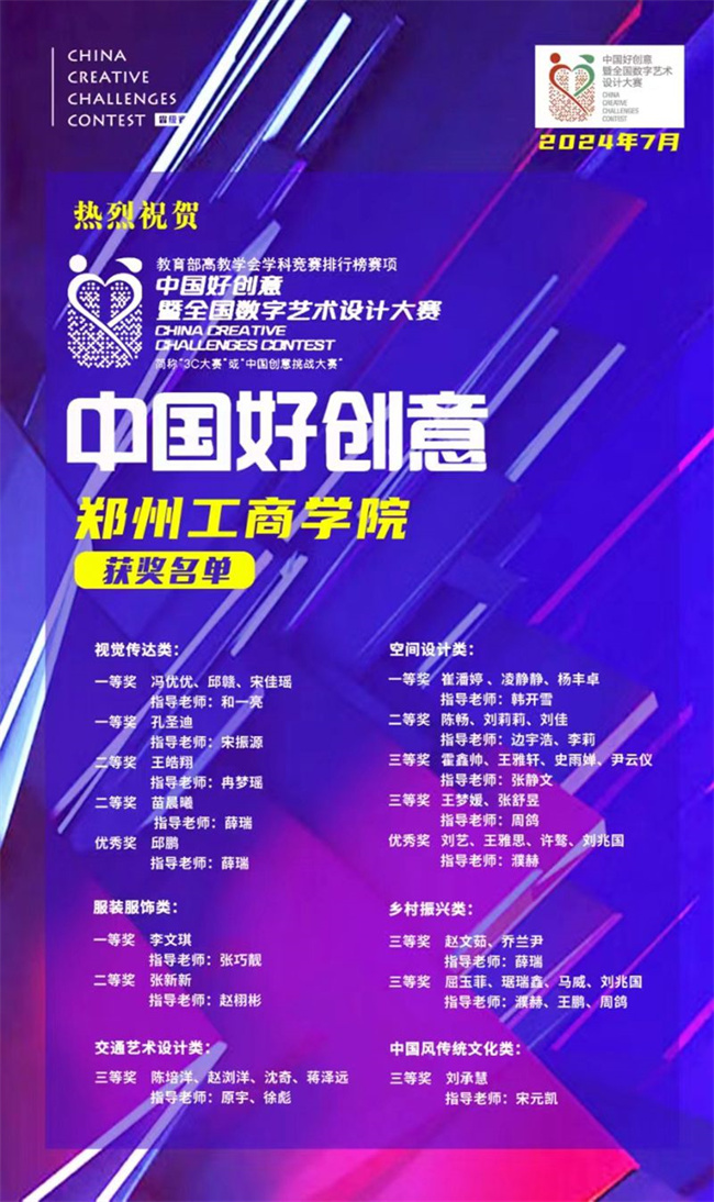 中國好創(chuàng)意暨全國數(shù)字藝術設計大賽是入選教育部中國高等教育學會發(fā)布的《全國普通高校學科競賽排行榜》賽項,是我國跨學科、多專業(yè)、影響廣泛的權威賽事。自賽訊發(fā)布以來,鄭州工商學院藝術學院高度重視此項競賽,秉承“以賽促學、以賽促教”的育人理念,統(tǒng)籌安排、廣泛宣傳動員學生參賽,以專業(yè)競賽為牽引,著力提升學生創(chuàng)新能力。