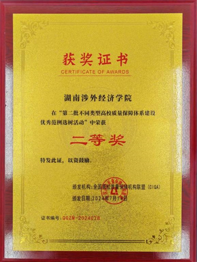 中新河南網(wǎng)8月9日電(唐立紅) 7月26日-27日,由全國(guó)高校質(zhì)量保障機(jī)構(gòu)聯(lián)盟主辦的CIQA成立五周年(換屆)大會(huì)暨高校分類特色發(fā)展與質(zhì)量保障論壇在廣東省江門(mén)市舉行。會(huì)議公布了“第二批全國(guó)高校不同類型質(zhì)量保障體系建設(shè)優(yōu)秀范例”評(píng)選結(jié)果,湖南涉外經(jīng)濟(jì)學(xué)院榮獲普通本科院校組二等獎(jiǎng)。