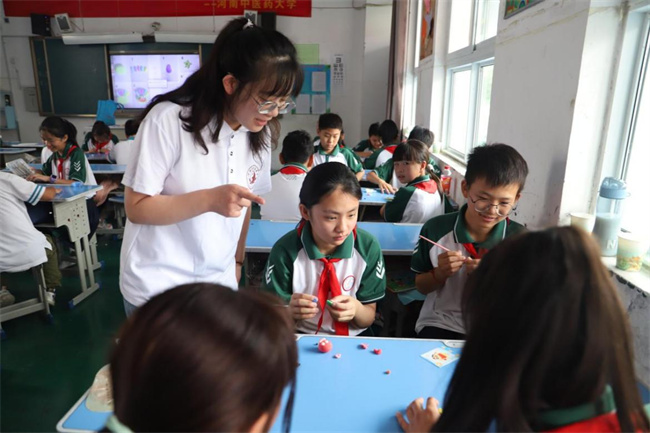 本次活動還精心設(shè)計了愛國主義教育、文化宣傳、思想引領(lǐng)、人文歷史、生物科學、素質(zhì)提升等多個領(lǐng)域的課程,旨在通過多樣化的教學內(nèi)容,激發(fā)孩子們的學習興趣,拓寬視野,播撒愛與希望的陽光。在多彩課堂上,志愿者以情景劇的形式對中醫(yī)藥文化進行了普及和宣傳;用生動有趣的手勢舞讓同學們感受到漢字的韻律美、結(jié)構(gòu)美以及中華文化的博大精深;以生動的英語動畫和兒歌激發(fā)同學們對英語的學習興趣;“心靈折翼”折紙課、“黏土手作”手工課、“七彩童年”扎染課等豐富多彩的素質(zhì)提升課程鍛煉同學們的動手能力,展現(xiàn)了他們的創(chuàng)造力和奇思妙想。