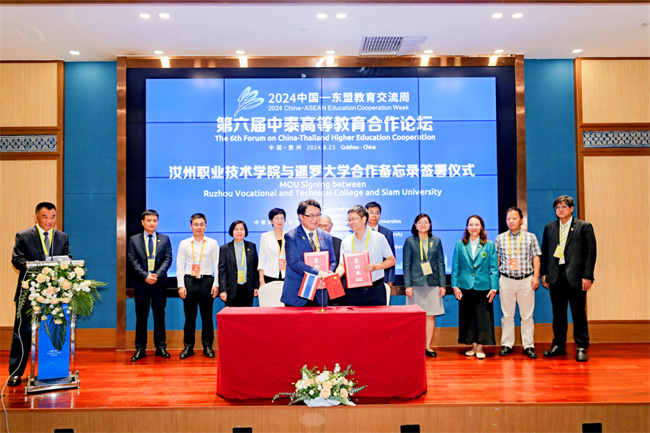 8月23日,主題為“深化大學(xué)高質(zhì)量合作,攜手培養(yǎng)國際化人才”第六屆中泰高等教育合作論壇”在貴安新區(qū)的中國—東盟教育交流周永久會址二樓斗篷山廳召開。本次論壇由江蘇大學(xué)、貴州大學(xué)、貴陽學(xué)院、東西方國際教育與中泰高等教育合作聯(lián)盟聯(lián)合主辦,吸引了來自中泰兩國20余所知名學(xué)府的80多位代表齊聚一堂。汝州職業(yè)技術(shù)學(xué)院劉延賓與泰國暹羅大學(xué)校長蓬猜博士共同簽署“MOU合作備忘錄”。
