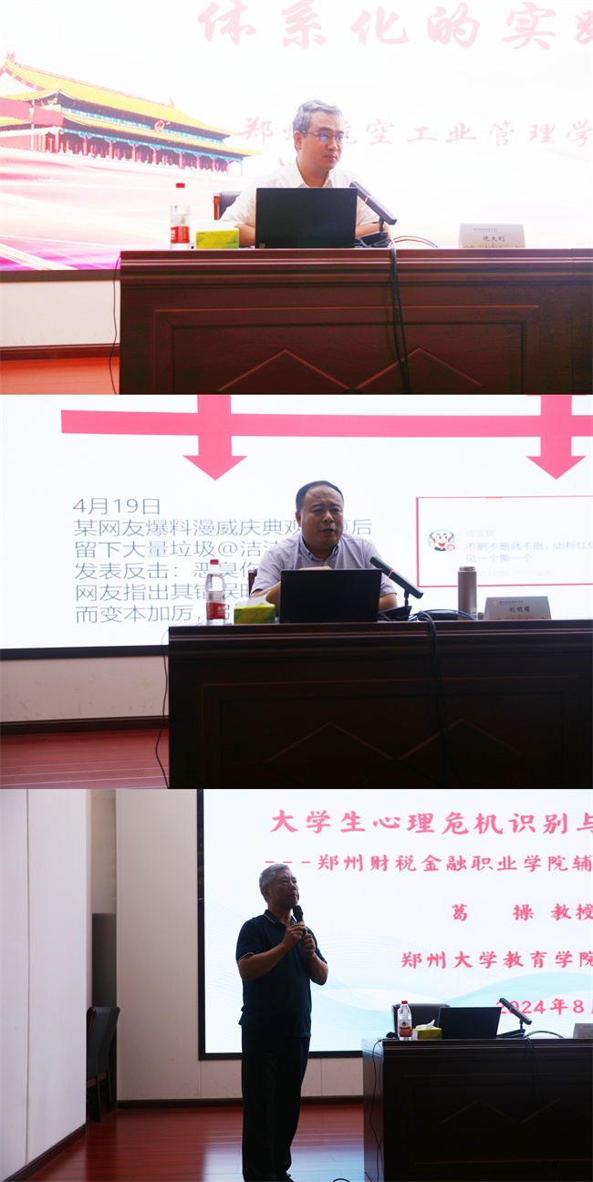 本次輔導(dǎo)員培訓(xùn),該校邀請(qǐng)了多位省內(nèi)外知名專家,鄭州航空工業(yè)管理學(xué)院商學(xué)院黨委副書記倪大釗為我們揭示了新時(shí)代高校二級(jí)學(xué)院學(xué)生工作體系化的新路徑與新探索;遼寧生態(tài)工程職業(yè)學(xué)院原學(xué)工部部長(zhǎng)劉明耀深入剖析了學(xué)生日常教育管理中的潛在危機(jī)與應(yīng)對(duì)策略;中國(guó)心理學(xué)會(huì)注冊(cè)系統(tǒng)臨床督導(dǎo)師、鄭州大學(xué)教育學(xué)院心理學(xué)系教授葛操以“大學(xué)生心理危機(jī)的識(shí)別與穩(wěn)定化干預(yù)技術(shù)”為主題,深入剖析了當(dāng)前高校大學(xué)生心理健康的發(fā)展態(tài)勢(shì),全面剖析了大學(xué)生常見的心理問題及其成因。