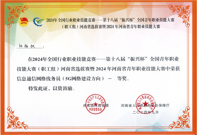 學(xué)校團(tuán)委精心組織、學(xué)院認(rèn)真籌備,選派兩名青年教師參賽。最終,信息通信學(xué)院青年教師江揚(yáng)帆在信息通信網(wǎng)絡(luò)線務(wù)員(5G網(wǎng)絡(luò)建設(shè)方向)賽道中獲得全省第一名,電氣工程學(xué)院青年教師閆旭陽在電工賽道中獲得全省第六名,取得新突破。