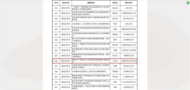 中新河南網(wǎng)9月18日電 2024年9月14日,全國(guó)哲學(xué)社會(huì)科學(xué)工作辦公室發(fā)布了《關(guān)于2024年國(guó)家社會(huì)科學(xué)基金年度項(xiàng)目立項(xiàng)名單的公示》。湖南涉外經(jīng)濟(jì)學(xué)院商學(xué)院王濤生教授主持的《新質(zhì)生產(chǎn)力驅(qū)動(dòng)出口高質(zhì)量發(fā)展的機(jī)制與路徑研究》項(xiàng)目脫穎而出,成功獲批立項(xiàng),該校也成為2024年度湖南省內(nèi)唯一一所獲批此類(lèi)項(xiàng)目的民辦本科院校。至此,改校已累計(jì)獲批國(guó)家社會(huì)科學(xué)基金項(xiàng)目4項(xiàng)。