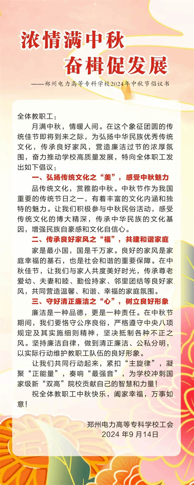 鄭州電力高等?茖W校工會還向全體教職工發(fā)布了《鄭州電力高等專科鄭州電力高等?茖W校2024年中秋節(jié)倡議書》。號召全體教職工弘揚傳統(tǒng)文化之“美”,感受中秋魅力;傳承良好家風之“福”,共建和諧家庭;守好清正廉潔之“心”,樹立良好形象,共同行動,緊扣“主旋律”,凝聚“正能量”,奏響“最強音”,為學校沖刺國家級新“雙高”院校貢獻自己的智慧和力量。