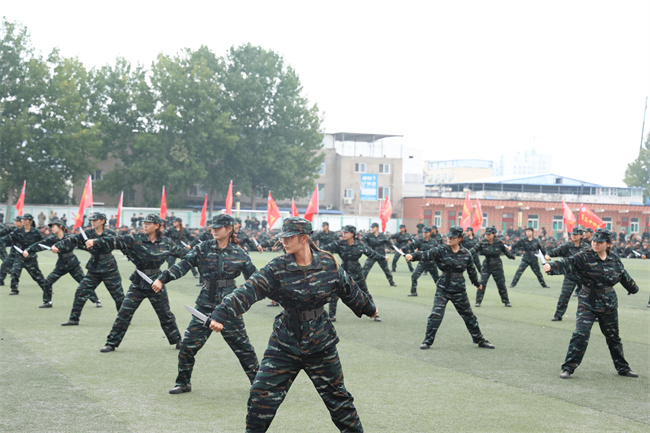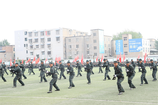 在激昂豪邁的軍樂(lè)聲中,51個(gè)軍訓(xùn)連隊(duì)精神抖擻、步履鏗鏘,依次通過(guò)主席臺(tái)接受檢閱,部分新生還進(jìn)行了擒敵拳、匕首操、刺殺操、戰(zhàn)術(shù)表演等軍事成果匯報(bào)。