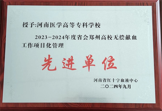 河南醫(yī)學(xué)高等專(zhuān)科學(xué)校榮獲2023-2024年度省會(huì)鄭州高校無(wú)償獻(xiàn)血工作項(xiàng)目化管理先進(jìn)單位