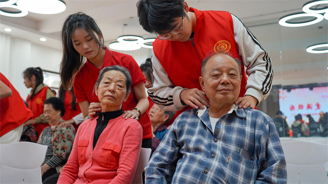 體育系組織師生為退休教師表演二十四式太極養(yǎng)生操,并由體育系教師講解秋冬季節(jié)的保健養(yǎng)生知識。同時,學(xué)生志愿者們熱情為退休教師進(jìn)行康養(yǎng)按摩,沉浸式的互動體驗,讓在場的師生們感受頗深。