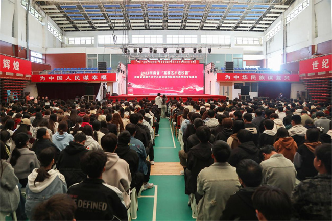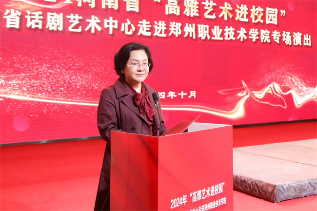 黨委書記呂村代表全校師生對(duì)河南話劇藝術(shù)中心各位藝術(shù)家的到來(lái),表示熱烈的歡迎和誠(chéng)摯的感謝!呂書記在講話中指出,鄭州職業(yè)技術(shù)學(xué)院自2012年以來(lái)堅(jiān)持將“高雅藝術(shù)進(jìn)校園”作為開展大學(xué)生素質(zhì)教育的重要載體,引領(lǐng)師生“走進(jìn)藝術(shù)、聆聽經(jīng)典、陶冶情操、提高素養(yǎng)”,形成充滿活力、多方協(xié)作、開放多元的學(xué)校美育新格局,有力引領(lǐng)了高質(zhì)量校園文化的發(fā)展。她強(qiáng)調(diào),當(dāng)前,鄭州職業(yè)技術(shù)學(xué)院正處在爬坡過(guò)坎、努力升本的建設(shè)中,需要我們鼓足十分干勁。今天,我們重溫焦裕祿這位人民公仆感人至深的事跡,不僅是一場(chǎng)文化藝術(shù)的盛宴,更是一堂思想政治課,一堂形式特殊的黨課,希望大家要認(rèn)真感悟話劇《焦裕祿》帶來(lái)的深刻意義,從中汲取力量,傳承偉大精神,進(jìn)一步激發(fā)自身的緊迫感、責(zé)任感和使命感,勇?lián)鷷r(shí)代使命,砥礪實(shí)干奮進(jìn),奮力書寫鄭州職業(yè)技術(shù)學(xué)院職業(yè)教育高質(zhì)量發(fā)展的新篇章。
