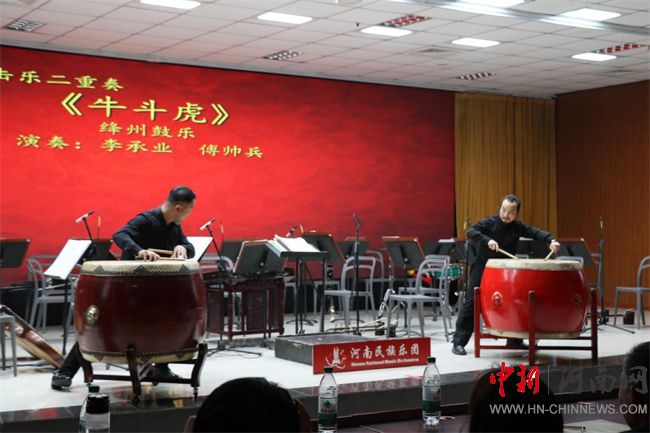 打擊樂二重奏《牛斗虎》用兩面大鼓象征牛、虎二獸,樂曲通過相遇、相戲、相斗三個樂段為觀眾展示出牛之倔強兇悍,虎之威武兇猛,引得臺下陣陣掌聲,將演出氛圍推向高潮。
