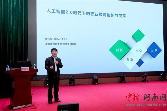 講座圍繞“從工業(yè)革命視角看新一代人工智能技術(shù)”“AI時(shí)代每個(gè)超級(jí)個(gè)體都有一個(gè)智能團(tuán)隊(duì)”“AIGC為專(zhuān)業(yè)領(lǐng)域帶來(lái)的機(jī)遇與挑戰(zhàn)”“數(shù)字員工的出現(xiàn)賦予職業(yè)技能教育的新使命”“第四次工業(yè)革命浪潮對(duì)職業(yè)教育的影響”等五個(gè)方面展開(kāi)。唐東平在人工智能時(shí)代及第四次工業(yè)革命的背景下,對(duì)職業(yè)教育技術(shù)的創(chuàng)新與變革進(jìn)行了深入講解,介紹了相關(guān)信息化教學(xué)技術(shù)和方法,展示了職業(yè)教育在人工智能浪潮中的無(wú)限可能;通過(guò)具體案例展示了AI 2.0時(shí)代人工智能技術(shù)在創(chuàng)意、教育、醫(yī)療健康等領(lǐng)域的實(shí)際應(yīng)用,強(qiáng)調(diào)了這一技術(shù)在提升工作效率與創(chuàng)新能力方面的潛力;分享了人工智能在教材編寫(xiě)和教育教學(xué)過(guò)程中的問(wèn)題及解決方案,并提出通過(guò)人工智能輔助教學(xué),提高教學(xué)效率和學(xué)習(xí)效果的新模式。