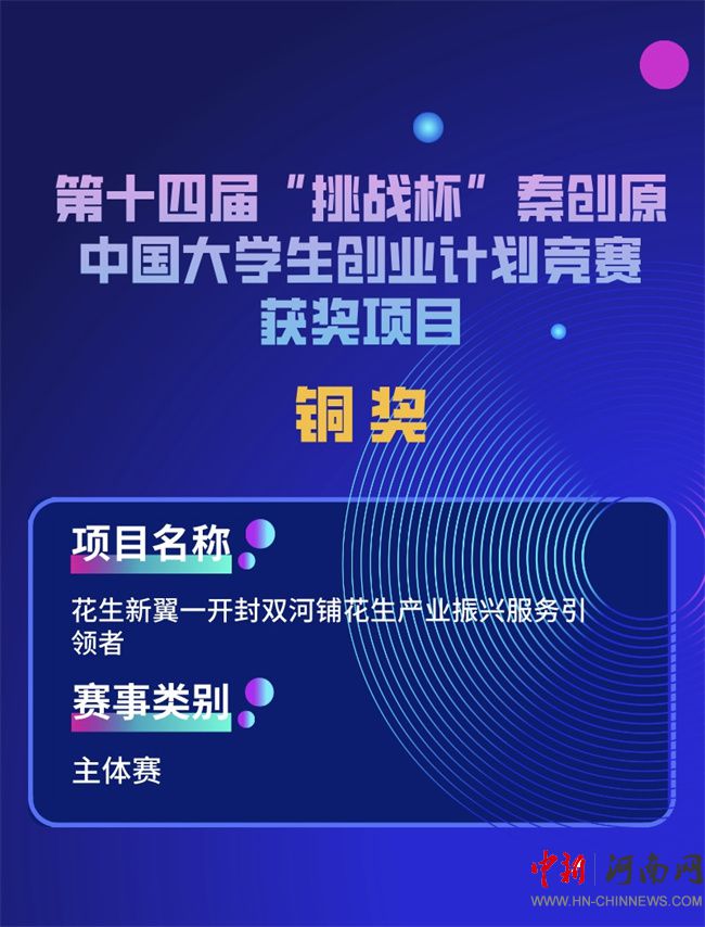 據(jù)悉,第十四屆“挑戰(zhàn)杯”秦創(chuàng)原中國(guó)大學(xué)生創(chuàng)業(yè)計(jì)劃競(jìng)賽由共青團(tuán)中央、教育部、人力資源社會(huì)保障部、中國(guó)科協(xié)、全國(guó)學(xué)聯(lián)、陜西省人民政府聯(lián)合主辦,由西安交通大學(xué)、共青團(tuán)陜西省委承辦共吸引來(lái)自2700余所高校的300多萬(wàn)名學(xué)生參與,累計(jì)提交39萬(wàn)余個(gè)創(chuàng)新創(chuàng)業(yè)項(xiàng)目。開封文化藝術(shù)職業(yè)學(xué)院《花生新翼——開封雙河鋪花生產(chǎn)業(yè)振興服務(wù)引領(lǐng)者》項(xiàng)目突出重圍,入圍全國(guó)決賽并斬獲銅獎(jiǎng)。