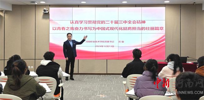 中新河南網(wǎng)12月16日電(谷世飛) 12月13日上午,河南職業(yè)技術(shù)學(xué)院黨委書記厲勵(lì)以“認(rèn)真學(xué)習(xí)貫徹黨的二十屆三中全會(huì)精神,以青春之我奮力書寫為中國式現(xiàn)代化挺膺擔(dān)當(dāng)?shù)膲邀惼?rdquo;為題,為智能制造學(xué)院2024級(jí)數(shù)控技術(shù)專業(yè)的同學(xué)們講授了一堂既有思想性、理論性又充滿啟發(fā)性、親和力的生動(dòng)思政課。