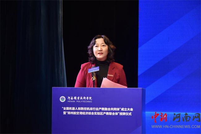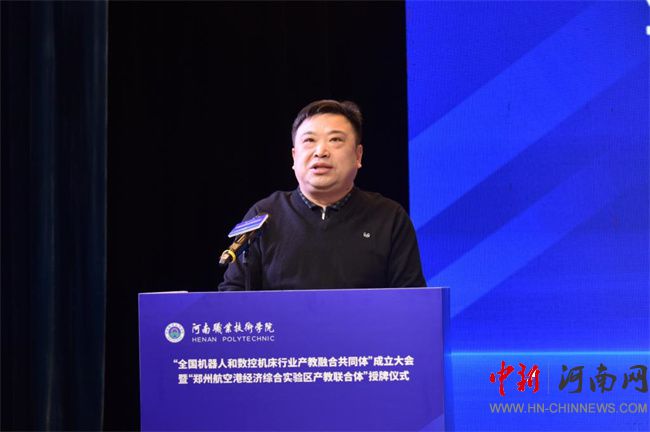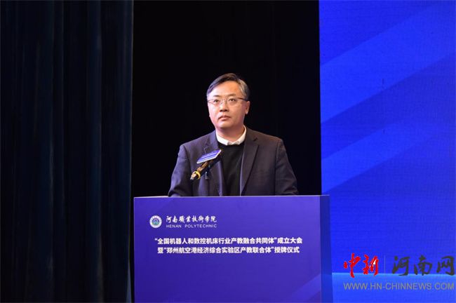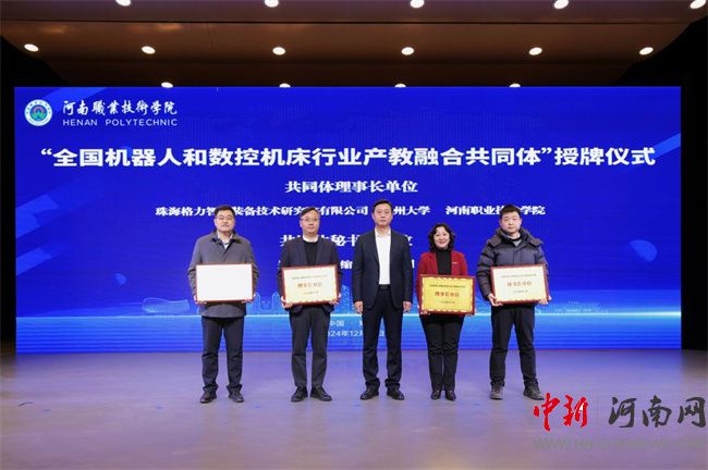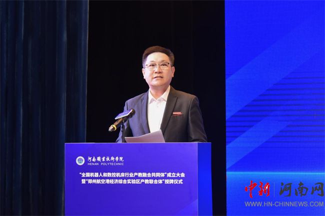 中新河南網(wǎng)12月21日電(鄧會敏) 12月19日上午,全國機器人和數(shù)控機床行業(yè)產(chǎn)教融合共同體成立大會暨鄭州航空港經(jīng)濟綜合實驗區(qū)產(chǎn)教聯(lián)合體授牌儀式在河南職業(yè)技術(shù)學(xué)院(以下簡稱該校)舉行。河南省教育廳黨組成員、副廳長張國強,河南省工業(yè)和信息化廳黨組成員、副廳長孫永民,機械工業(yè)教育發(fā)展中心主任陳曉明,鄭州大學(xué)黨委常委、副校長胡少偉,珠海格力智能裝備技術(shù)研究院有限公司副總經(jīng)理陳威,富士康科技集團富聯(lián)裕展科技(河南)有限公司副總經(jīng)理張占武,鄭州航空港經(jīng)濟綜合實驗區(qū)教育衛(wèi)生體育局副局長郭帥,河南省機器人與數(shù)控機床行業(yè)協(xié)會會長王濟昌等出席會議。該校黨委書記厲勵,黨委副書記、校長夏新顏等校領(lǐng)導(dǎo)班子成員,以及共同體、聯(lián)合體會員單位領(lǐng)導(dǎo)和代表近200人參加大會。大會分別由夏新顏和校黨委委員、副校長肖瓏主持。