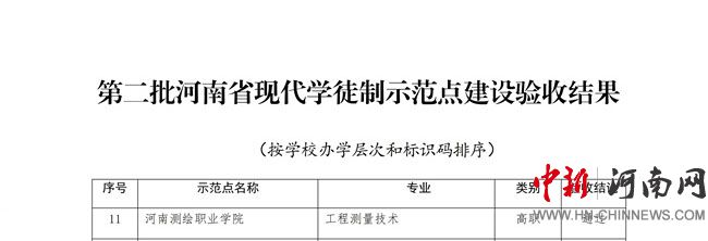 中新河南網(wǎng)12月23日電(朱小韋) 近日,河南省教育廳辦公室下發(fā)《關(guān)于公布第二批河南省現(xiàn)代學(xué)徒制示范點建設(shè)驗收結(jié)果的通知》,河南測繪職業(yè)學(xué)院測繪工程系工程測量技術(shù)專業(yè)順利通過現(xiàn)代學(xué)徒制示范點建設(shè)項目驗收。