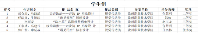 其中,郝會彤、馬路瑤共同完成的《天青汝韻——青沫 IP 形象設(shè)計》,任浩義、牛錦濤共同完成的《“豫見鄭州”插畫設(shè)計》分別獲得學(xué)生組二等獎;李雨蒙的《“洛小花”洛陽牡丹形象設(shè)計》,王家盛、高建行共同完成的《汝韻陶雅——念汝初 IP 形象設(shè)計》分別獲得學(xué)生組三等獎;郭廣哲、申延戰(zhàn)共同完成的《“遇見民宿”標(biāo)志設(shè)計》榮獲學(xué)生組優(yōu)秀獎;趙玉龍的《“梨園夢華”豫劇 IP 形象設(shè)計》獲教師組優(yōu)秀獎。