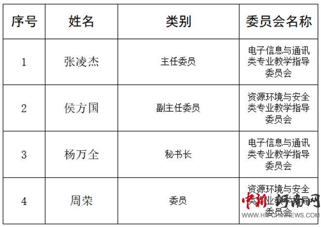 其中,校黨委副書記、校長張凌杰任電子信息與通訊類專業(yè)教學(xué)指導(dǎo)委員會主任委員;測繪技術(shù)產(chǎn)業(yè)學(xué)院院長侯方國任資源環(huán)境與安全類專業(yè)教學(xué)指導(dǎo)委員會副主任委員;信息中心副主任楊萬全任電子信息與通訊類專業(yè)教學(xué)指導(dǎo)委員會秘書長;測繪工程系副主任周榮任資源環(huán)境與安全類專業(yè)教學(xué)指導(dǎo)委員會委員。