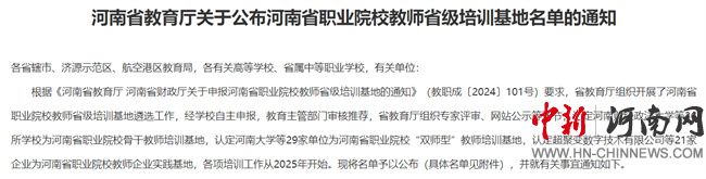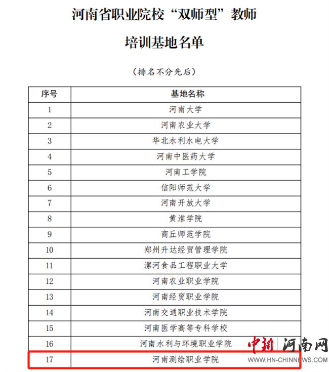 中新河南網12月26日電(王曉雯) 12月24日,河南省教育廳公布了《關于公布河南省職業(yè)院校教師省級培訓基地名單的通知》,河南測繪職業(yè)學院順利通過遴選,成功獲批為河南省職業(yè)院校“雙師型”教師培訓基地。