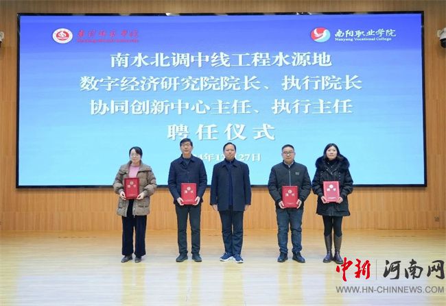 董聯(lián)軍代表學校正式聘任南陽師范學院經(jīng)濟與管理學院院長姜長寶為南水北調(diào)中線工程水源地數(shù)字經(jīng)濟研究院院長、南陽職業(yè)學院商學院院長余娟為執(zhí)行院長,南水北調(diào)中線水源區(qū)水安全協(xié)同創(chuàng)新中心主任何俊寶為協(xié)同創(chuàng)新中心主任、南陽職業(yè)學院發(fā)展規(guī)劃處處長萬樂為執(zhí)行主任。