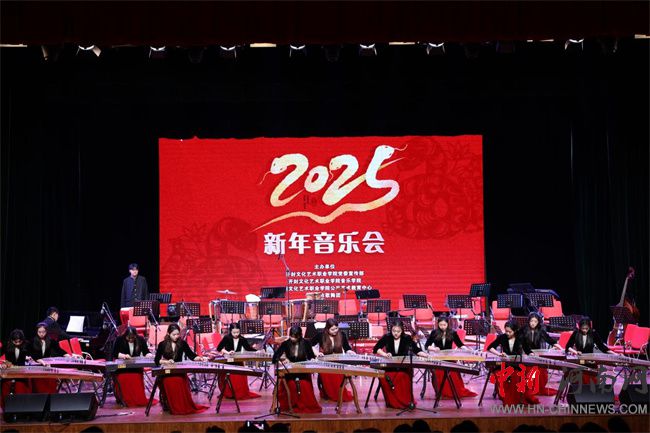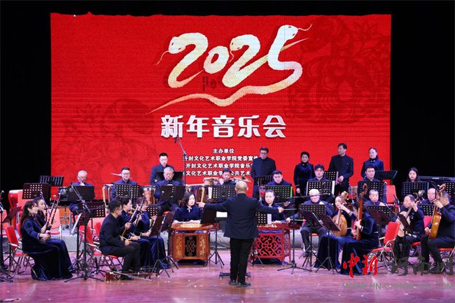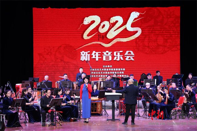 音樂(lè)會(huì)以民樂(lè)為主,共演繹了12首不同風(fēng)格的曲目,這些曲目中,既有經(jīng)典的傳統(tǒng)曲目,又有現(xiàn)代的創(chuàng)新之作。每一段旋律都承載著豐富的文化內(nèi)涵和情感表達(dá),彰顯了民族音樂(lè)的獨(dú)特魅力,體現(xiàn)了民族精神和文化自信。《北京喜訊》《紅色娘子軍組曲》以管弦樂(lè)宏大的氣勢(shì)和豐富的音樂(lè)表現(xiàn)力,展現(xiàn)出特定時(shí)代的風(fēng)貌;歌曲《青玉案》憑借獨(dú)特的韻味和優(yōu)美的旋律,為觀眾帶來(lái)別樣的聽(tīng)覺(jué)享受;合奏《我的祖國(guó)》帶領(lǐng)人們領(lǐng)略祖國(guó)壯麗山河;笛子獨(dú)奏《牧民新歌》用靈動(dòng)的音符描繪出草原的遼闊與牧民的生活場(chǎng)景;京劇江姐選段《春蠶》讓傳統(tǒng)戲曲的魅力得以展現(xiàn);二胡協(xié)奏曲《風(fēng)波亭》則將民族樂(lè)器獨(dú)特的魅力發(fā)揮得淋漓盡致;合奏電視劇《大宅門》主題曲 —— 蘆溝曉月,具有獨(dú)特韻味;獨(dú)唱《沁園春·雪》以大氣磅礴的風(fēng)格展現(xiàn)出偉人的豪邁情懷!蹲鎳(guó)紅花遍地開(kāi)》更是以歡快的節(jié)奏讓現(xiàn)場(chǎng)觀眾掌聲不斷。其中,開(kāi)封文化藝術(shù)職業(yè)學(xué)院音樂(lè)學(xué)院民族室內(nèi)樂(lè)團(tuán)和古箏樂(lè)團(tuán)帶來(lái)的極具新春氣質(zhì)的《金蛇狂舞》《映山紅主題隨想曲》,迅速將觀眾帶入到歡快熱烈的氣氛中。激昂的鑼鼓、歡快的弦樂(lè)交織在一起,讓觀眾觀賞了音色豐富、音域?qū)拸V、表現(xiàn)力強(qiáng)、具有民族特色樂(lè)器演奏的樂(lè)曲,充分展示了開(kāi)封文化藝術(shù)職業(yè)學(xué)院民族樂(lè)團(tuán)的專業(yè)素養(yǎng)和實(shí)力。