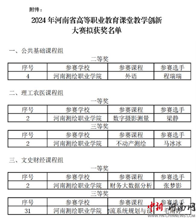 這一年,組織多項(xiàng)校內(nèi)競賽、選拔賽,推動教師們在各級各類比賽中表現(xiàn)出色,在高等職業(yè)教育教學(xué)能力大賽、河南省教育系統(tǒng)2024年度教學(xué)技能競賽等競賽中獲多個獎項(xiàng),其中特等獎1項(xiàng),一等獎3項(xiàng),二等獎8項(xiàng),三等獎14項(xiàng)。