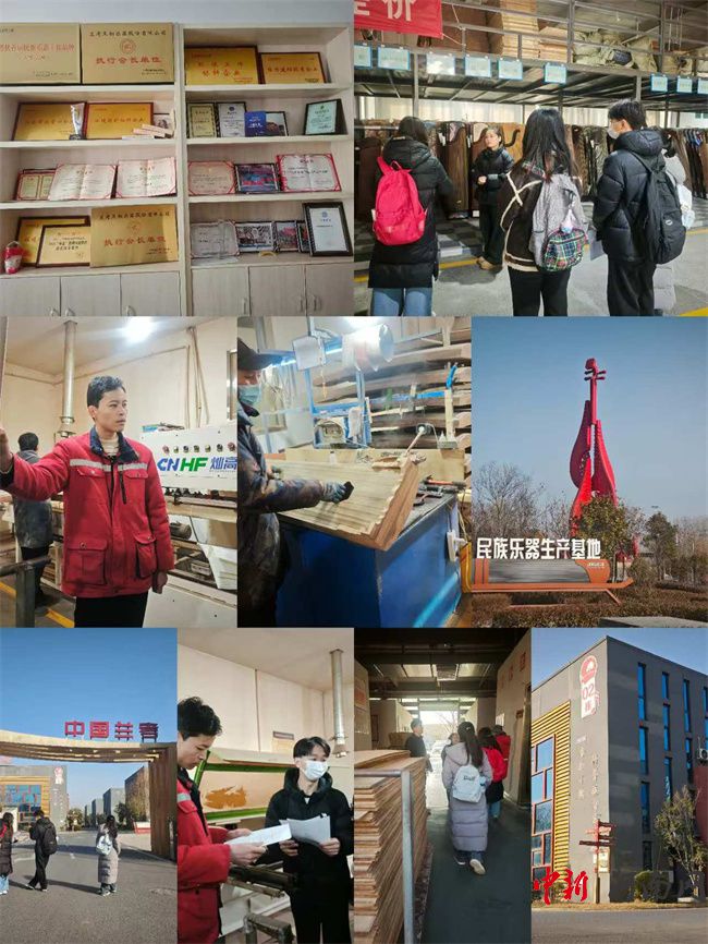 之后,團(tuán)隊抵達(dá)中國民族樂器村——蘭考縣堌陽鎮(zhèn)徐場村。村內(nèi)制作聲與彈奏聲交織,家家戶戶的古箏廠房展現(xiàn)出產(chǎn)業(yè)的繁榮。伯韻古箏產(chǎn)業(yè)廠長夫人和小朋友的精彩古箏演奏,以嫻熟指法和優(yōu)美旋律贏得熱烈掌聲,堅定了同學(xué)們助力產(chǎn)業(yè)發(fā)展的決心。