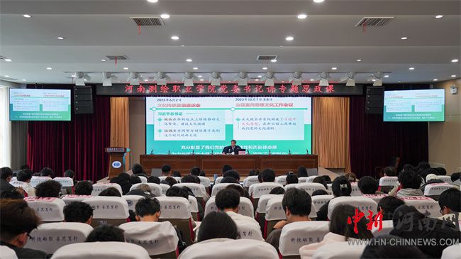 中新河南網(wǎng)3月5日電(何旭/文 鄭嶸淇/圖) 2月28日下午,河南測(cè)繪職業(yè)學(xué)院黨委書(shū)記張樹(shù)嶺在多功能報(bào)告廳講授題為《加快建設(shè)社會(huì)主義文化強(qiáng)國(guó)》的專題思政課。全體思政課教師以及部分學(xué)生代表聆聽(tīng)學(xué)習(xí)。