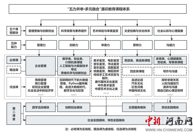 圍繞管理力、創(chuàng)新力、審美力、思辨力、溝通力這五大核心能力,精心設(shè)置系列課程與實踐活動,打破了傳統(tǒng)專業(yè)教育與通識教育之間的界限,強調(diào)“多元融合”,將人文社科、自然科學(xué)、藝術(shù)修養(yǎng)、商業(yè)管理以及創(chuàng)新創(chuàng)業(yè)等多個領(lǐng)域知識有機融合,形成跨學(xué)科的課程體系,拓寬學(xué)生的知識視野,激發(fā)創(chuàng)新思維,培養(yǎng)學(xué)生的綜合素質(zhì)。