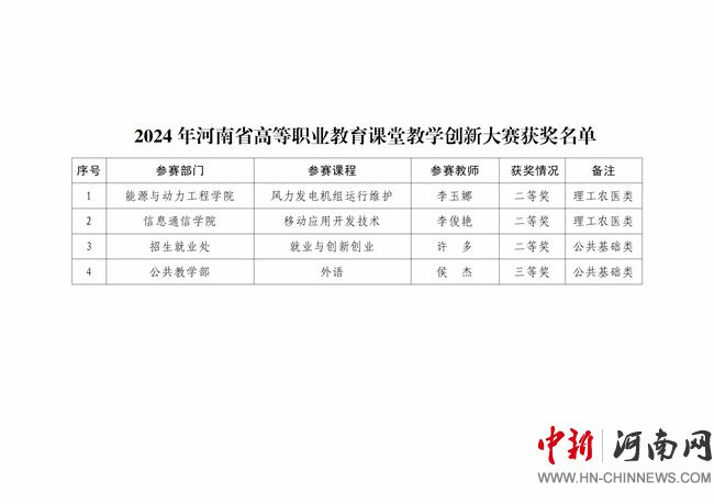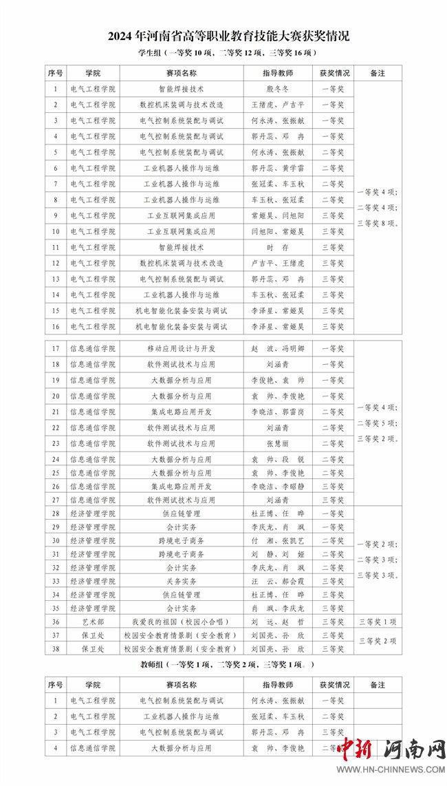 2024年河南省高等職業(yè)教育技能大賽設(shè)有學(xué)生組和教師組,該校共派出160名師生參加了17個(gè)項(xiàng)目的角逐,共獲獎(jiǎng)42項(xiàng),其中一等獎(jiǎng)11項(xiàng),二等獎(jiǎng)14項(xiàng),三等獎(jiǎng)17項(xiàng)。2024年河南省課堂教學(xué)創(chuàng)新大賽經(jīng)過(guò)學(xué)校比賽、省級(jí)網(wǎng)絡(luò)初評(píng)、省級(jí)現(xiàn)場(chǎng)比賽等環(huán)節(jié)的激烈角逐,該校教師共獲得二等獎(jiǎng)3項(xiàng)、三等獎(jiǎng)1項(xiàng)。大賽成績(jī)的取得,是該校長(zhǎng)期以來(lái)堅(jiān)持立德樹(shù)人根本任務(wù),深化教育教學(xué)改革,加強(qiáng)師資隊(duì)伍建設(shè),注重學(xué)生實(shí)踐能力培養(yǎng)的結(jié)果。