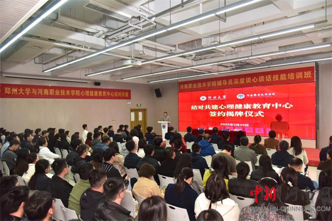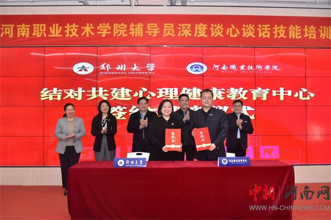 中新河南網(wǎng)3月31日電(楊麗) 3月29日下午,河南職業(yè)技術(shù)學(xué)院與鄭州大學(xué)結(jié)對(duì)共建心理健康教育中心簽約揭牌儀式在河職創(chuàng)新港舉行。鄭州大學(xué)黨委副書記王利國、河南職院黨委書記厲勵(lì)出席簽約儀式并致辭。校黨委副書記、工會(huì)主席田華主持簽約儀式。校黨委委員、副校長任楓軒,鄭州大學(xué)黨委學(xué)生工作部部長冀娟、大學(xué)生心理健康中心主任劉慧瀛參加。