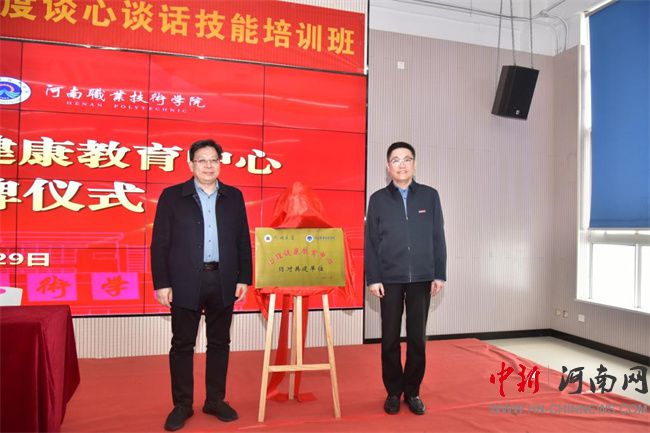 河南職業(yè)技術(shù)學(xué)院黨委書記厲勵(lì)與鄭州大學(xué)黨委副書記王利國共同為心理健康教育中心揭牌